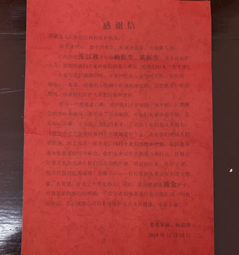 心内科的张以政主任和杨医生、莫医生及全体医护人员,请接受我们全家对你们的衷心感谢。愿你们好人一生平安!